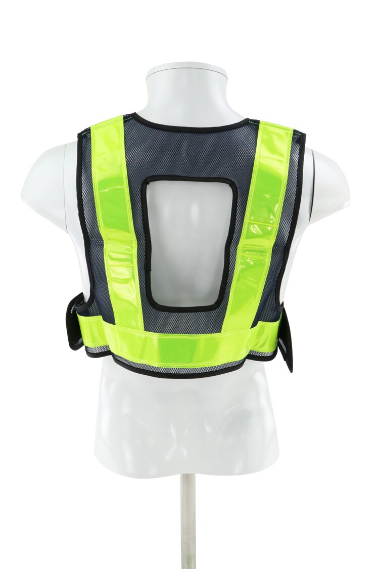 | サイズ:フリーサイズ 着丈:約40cm 胴回り:約90~130cm(マジックテープで調整可能) 本体:ラッセルメッシュ(ポリエステル) 反射:高輝度マイクロプリズム(PVC) カラー:ネイビー*蛍光イエロー |