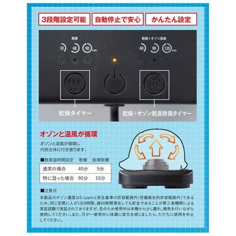 | 電源:AC100V 消費電力:最大250W 温風温度:約60度 オゾン発生量:最大50mg/h 保証期間:6ヶ月 材質:本体/ABS樹脂 |