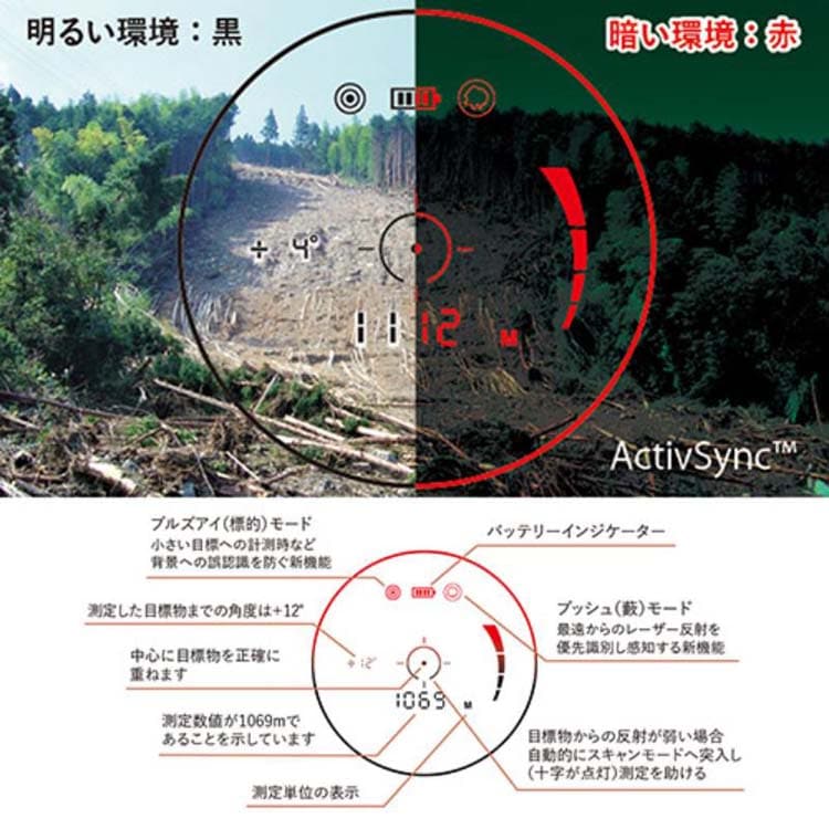 ●距離計を覗き込んだときの液晶表示が、明るい環境では黒、暗い環境では赤に自動で変化します。