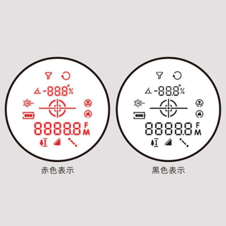 ●多彩な測定項目 : 直線距離(傾斜距離) 垂直距離 水平距離 傾斜角度 目標物の高さ 垂直間隔直線距離 高低差 垂直間隔水平距離 二点間の傾斜角度