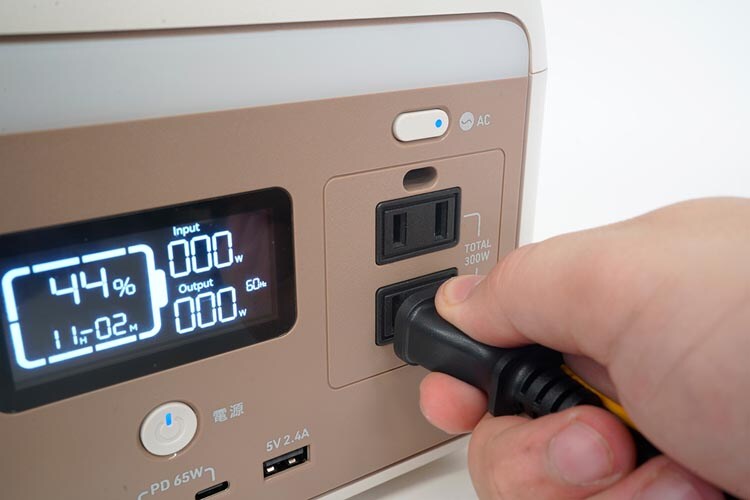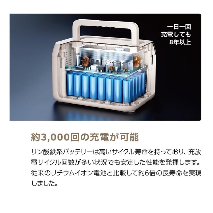 | ・バッテリー容量:204Wh ・バッテリータイプ:リン酸鉄リチウムイオン電池(LiFePO4) ・使用サイクル:3000回以上(80%) ・総出力:300W ・AC出力:100V 最大300W(2ポート合計)50/60Hz純正弦波 ・PD出力:最大65W(5V/9V/12V/15V3A/20V3.25A) (2ポート使用時:5V/9V3A/12V2.5A/15V2A/20V1.5A) ・USB出力:5V2.4A ・DC出力:12V8A(シガー出力) ・充電方法:AC100V/DC12V(シガー電源)/専用ソーラーパネル ・AC入力:100V 最大550W6A50/60Hz(充電時間目安約1.5時間) ・シガーアダプター入力:DC12V8A(充電時間目安約3時間) ・ソーラー入力:最大120WDC12~24V 最大8A ・保護機能:過熱保護、低温保護、低電圧保護、過電圧保護、過負荷保護、短絡保護、過電流保護 ・使用温度範囲:-10度~+45度(推奨+20~+30度) ・充電温度範囲:±0度~+45度(推奨+20~+30度) ・外形寸法:248×158×152mm ・質量:約3.7kg |