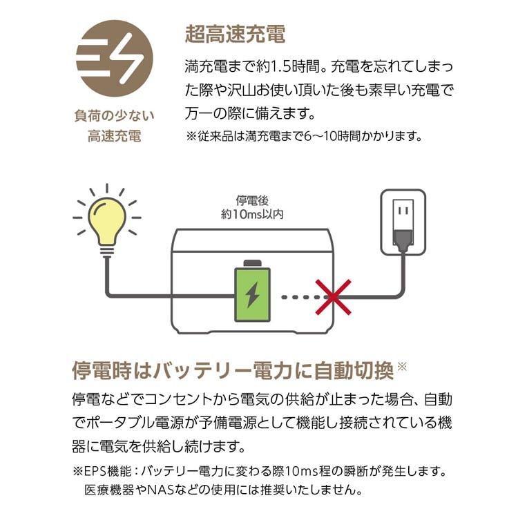 ※EPS機能:バッテリー電力に変わる際10ms程の瞬断が発生します。医療機器やNASなどの使用は推奨いたしません。