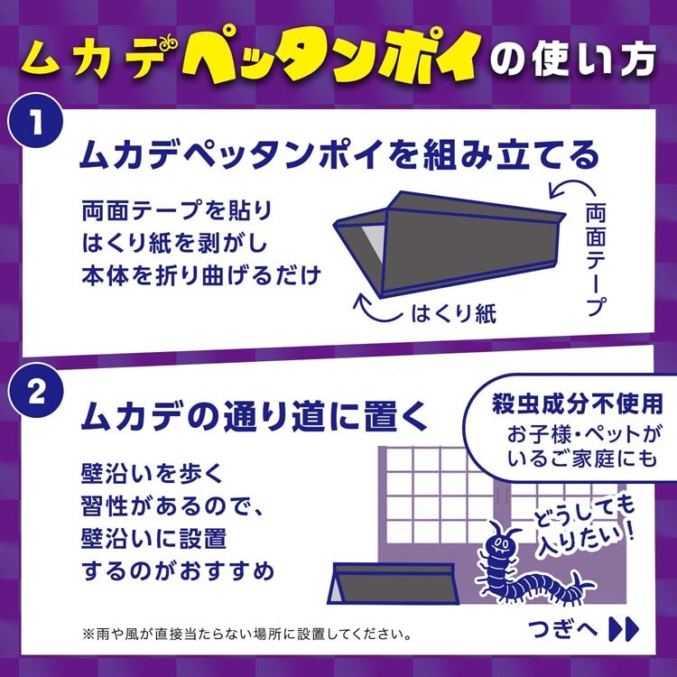 2.ムカデの通り道に置く。粘着面にはムカデが好きな甘いニオイを配合