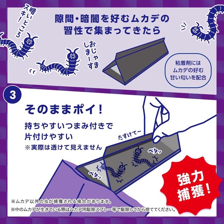 ●ムカデの好む甘いにおいを配合し、暗闇・隙間を好むムカデの習性を利用した粘着トラップです。