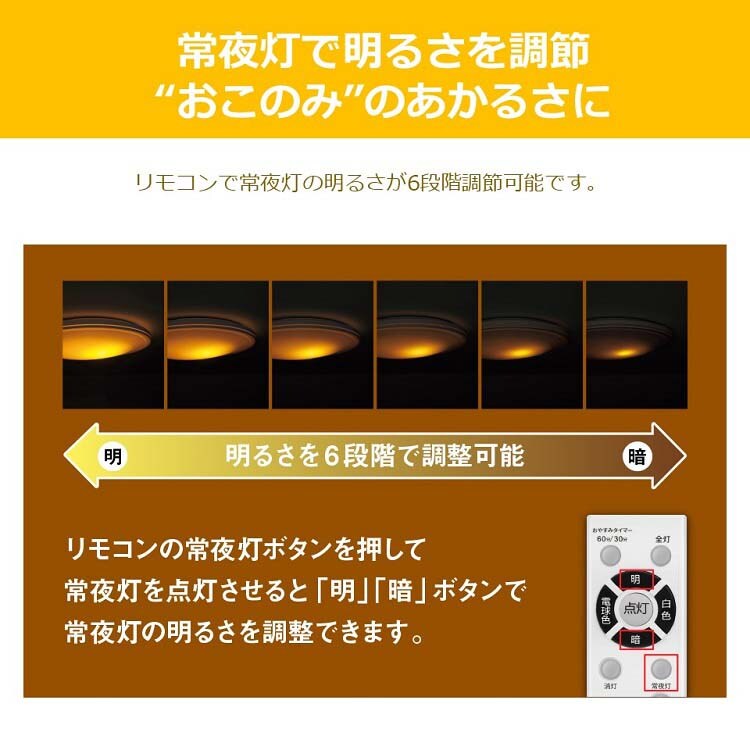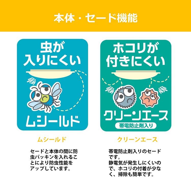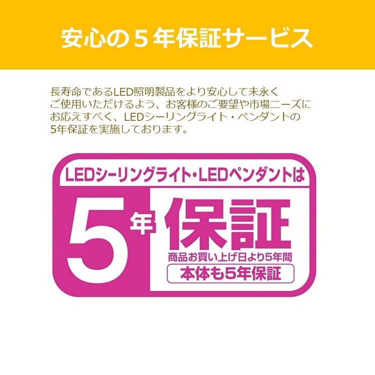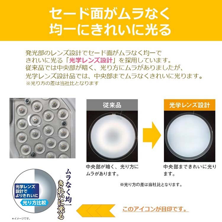 | 寸法: 幅φ664mm * 高さ120mm 本体質量:4.54kg 畳数:~14畳 色温度:昼光色(6500K)-電球色(2700K) 全光束 ※1:6099lm 消費電力 ※2: 40.6W 消費効率 ※3:150lm/W 調色機能 ※4:◯ 本体保証:5年保証 ※セード、リモコン送信器は1年間。 ※消耗品(電池等)は対象外となります。 ※1:全光束値は、主(全灯・全光時)に使用される光源色の最も高い光束値を表しています。 ※2:消費電力は、主(全灯・全光時)に使用される光源色の最も高い消費電力値を表しています。 ※3:明るさUP時は主(全灯・全光時)よりも固有エネルギー消費効率が低下します。 ※4:調色時は全光束、消費電力、固有エネルギー消費効率が変わります。 |