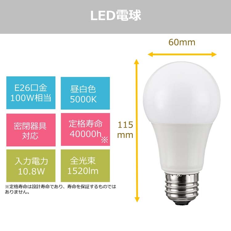 | ・メーカー名:NVC Lighting Japan ・口金:E26 ・配光角度:広配光(180度) ・光源色:昼白色(N) ・調光器対応:不可 ・明るさ:100W相当 ・定格寿命:40000h ・密閉形器具:可 |
