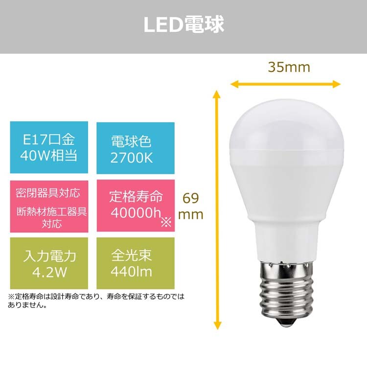 | ・メーカー名:NVC Lighting Japan ・口金:E17 ・配光角度:広配光(180度) ・光源色:電球色(L) ・調光器対応:不可 ・明るさ:40W相当 ・定格寿命:40000h ・密閉形器具、断熱材施工器具:可 |