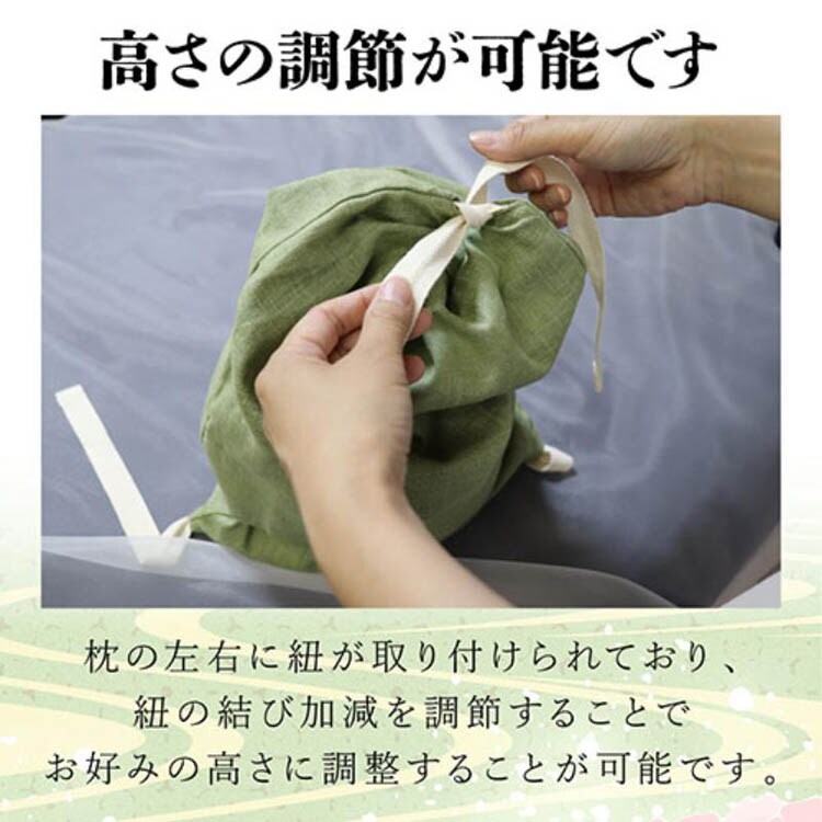 ・枕の左右に紐が取り付けられており、紐の結び加減を調節することでお好みの高さに調整することが可能です。