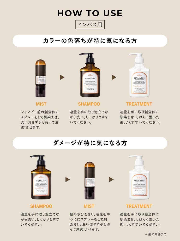 ・ヘマチン(※1):カラーした髪の色落ちを抑え、ダメージを受けた髪を補修する