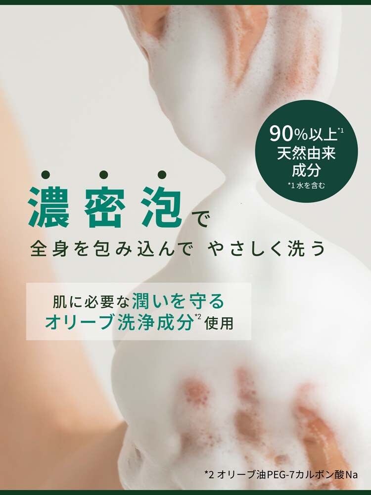 ●90%(※1)以上天然由来成分。たっぷりの泡立ちでやさしく洗う、グリーンとムスクが香るボディソープ。