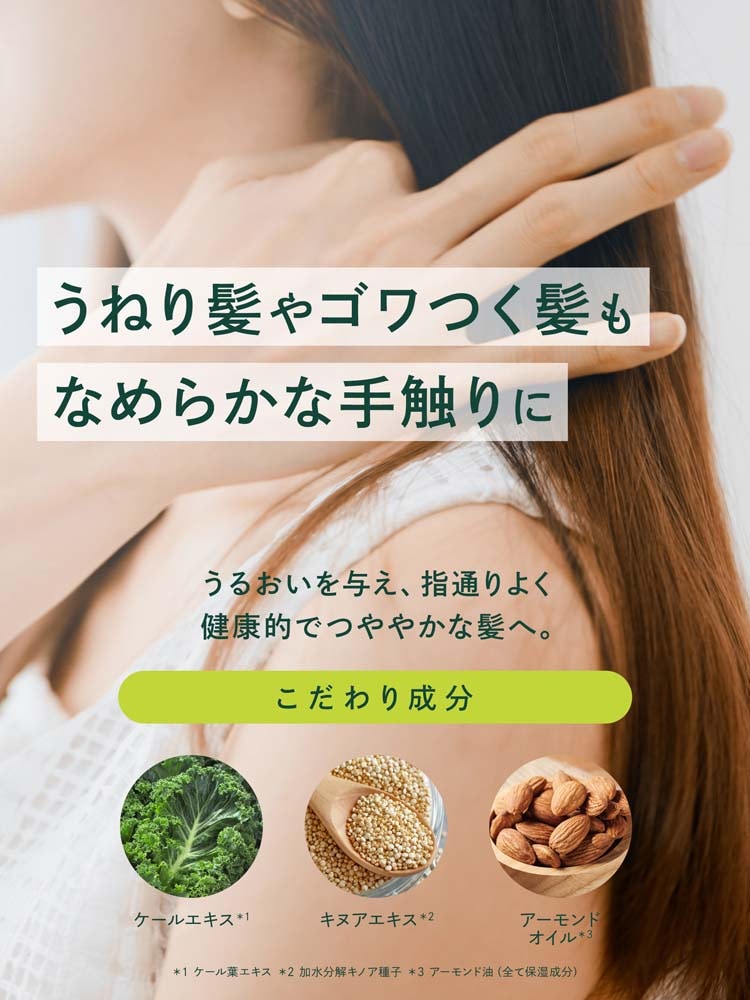 ●90%(水を含む)以上天然由来成分。ケール(*1)&キヌア(*2)&アーモンドオイル(*3)配合のシャンプー&トリートメントセット。