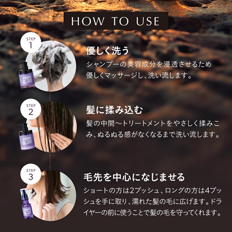 タオルドライした髪や乾いた髪に、適量を手のひらでよく伸ばし、毛先中心になじませてください。