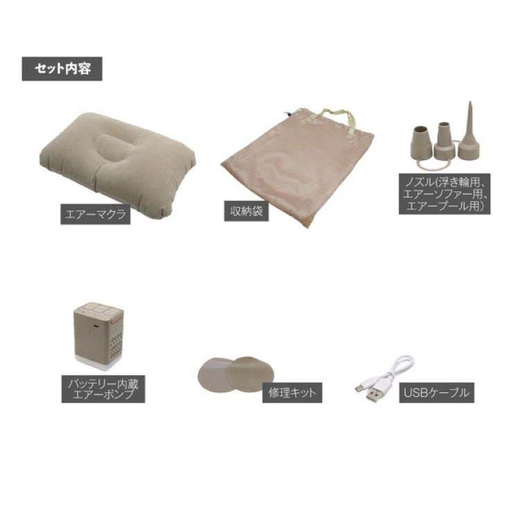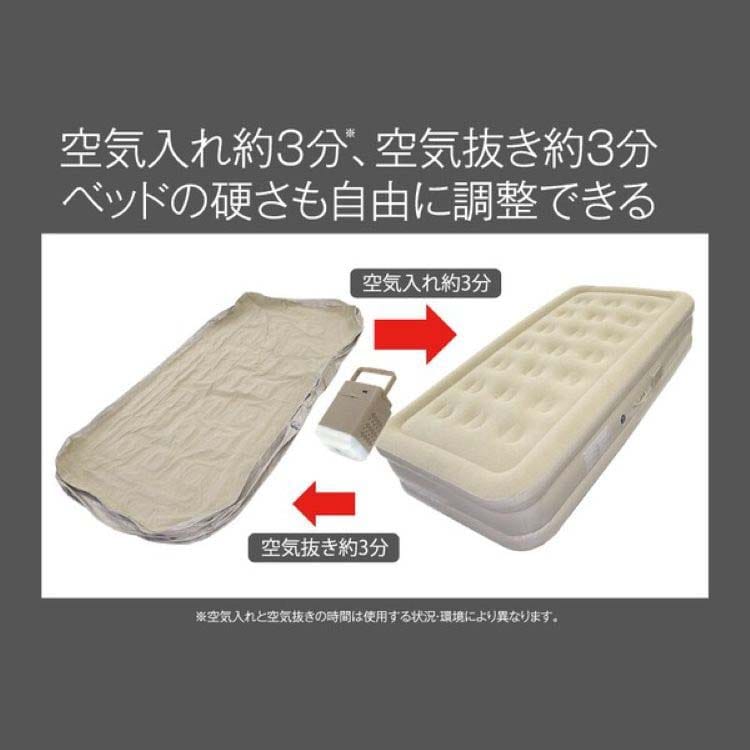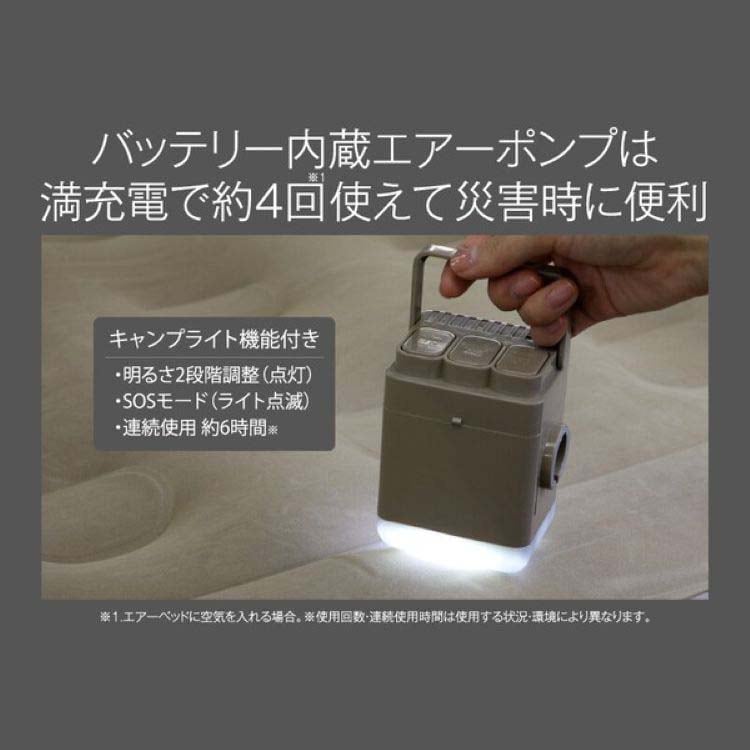| 使用時本体サイズ:約幅950×長さ1860×高さ370mm 付属品・バッテリー内蔵エアーポンプ・エアーマクラ・収納袋・修理キット・USBケーブル(Type-AtoC)・ノズル(浮き輪用、エアーソファー用、エアープール用)・取扱説明書 空気注入時間:約3分 空気排出時間:約3分 充電時間:約3時間 使用可能時間バッテリー内蔵エアーポンプ:本品を約4回充填可能(満充電時) キャンプライト:(1段目)SOSモードは約6時間/(2段目)約4時間 |