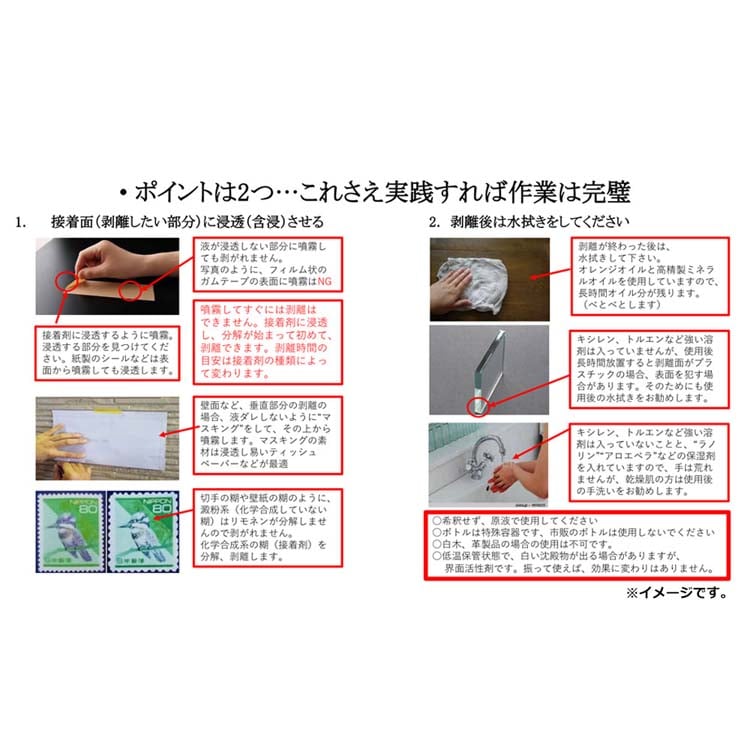 ●シール・ガム・接着剤など粘性のあるものを剥離、頑固な油汚れも簡単に剥がし落とします。