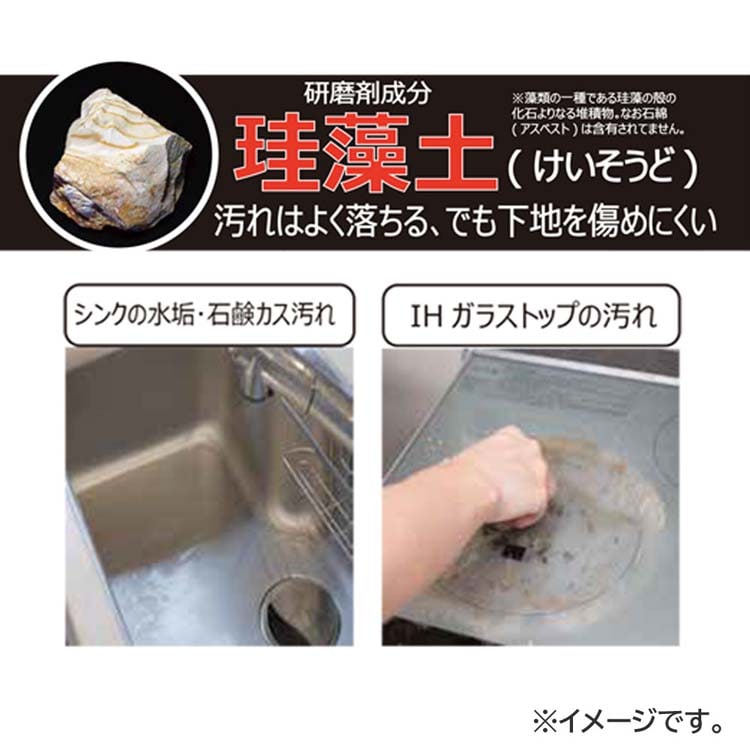 | 液性:弱アルカリ性。 (材質) 研磨剤:(14%けい酸系鉱物)。オレンジオイル。 界面活性剤:14.6%ヤシ油脂肪酸塩・ポリオキシアルキレンアルキルエーテル。 |