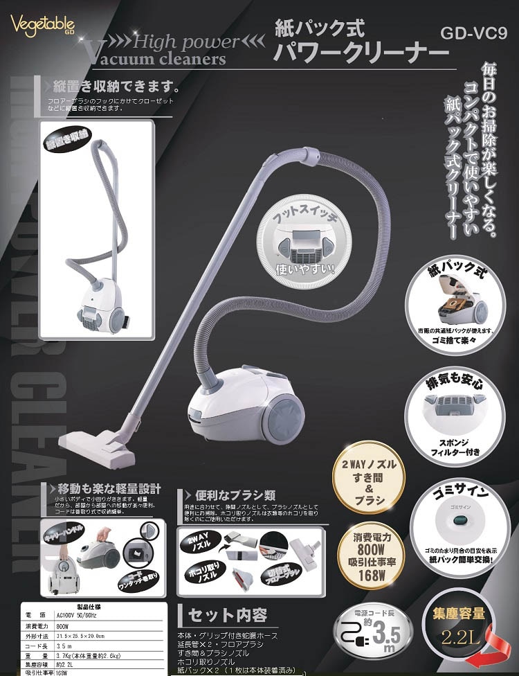 【ベジタブル 紙パック式 パワークリーナー GD-VC9の商品詳細】