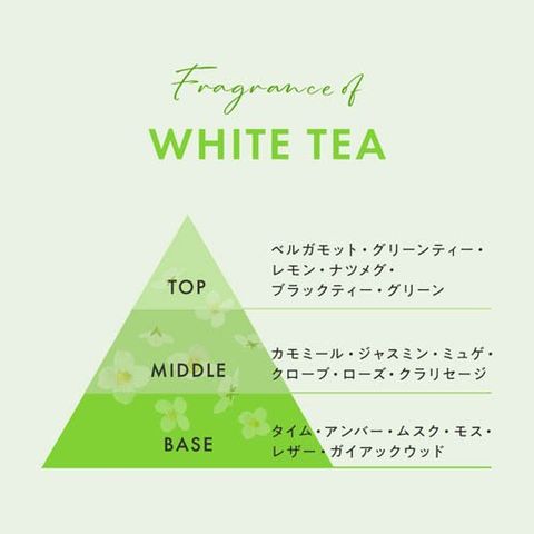 ●ホワイトティーの香りには、チャ葉油(整肌)を配合し、お肌のキメを整えます。