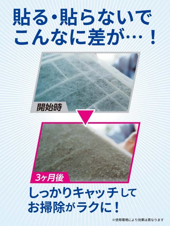 ※使用できない機種:吸気口が自動開閉するタイプ、前面パネルが自動開閉するタイプ、エアコン備え付けフィルターがむき出しのタイプ、本製品よりもフィルターを貼るスペースが大きいタイプ ※自動お掃除機能が稼働するとフィルターに干渉することがあります。