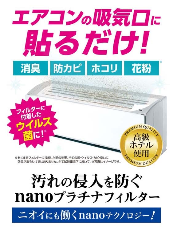 ●ホテルでも使用、吸気口に貼って汚れの侵入を防ぐ(※1)、エアコンのnanoプラチナフィルター。