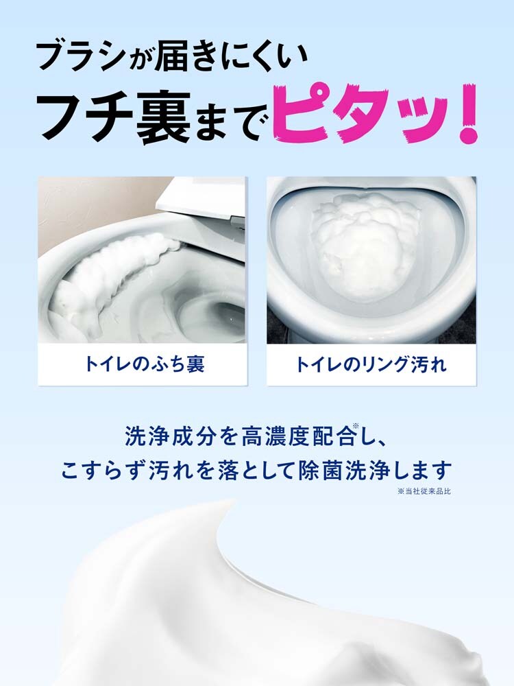 ●洗浄成分を高濃度で配合、ふち裏の黒ずみ・リング汚れもこすらずに落とし除菌洗浄します。