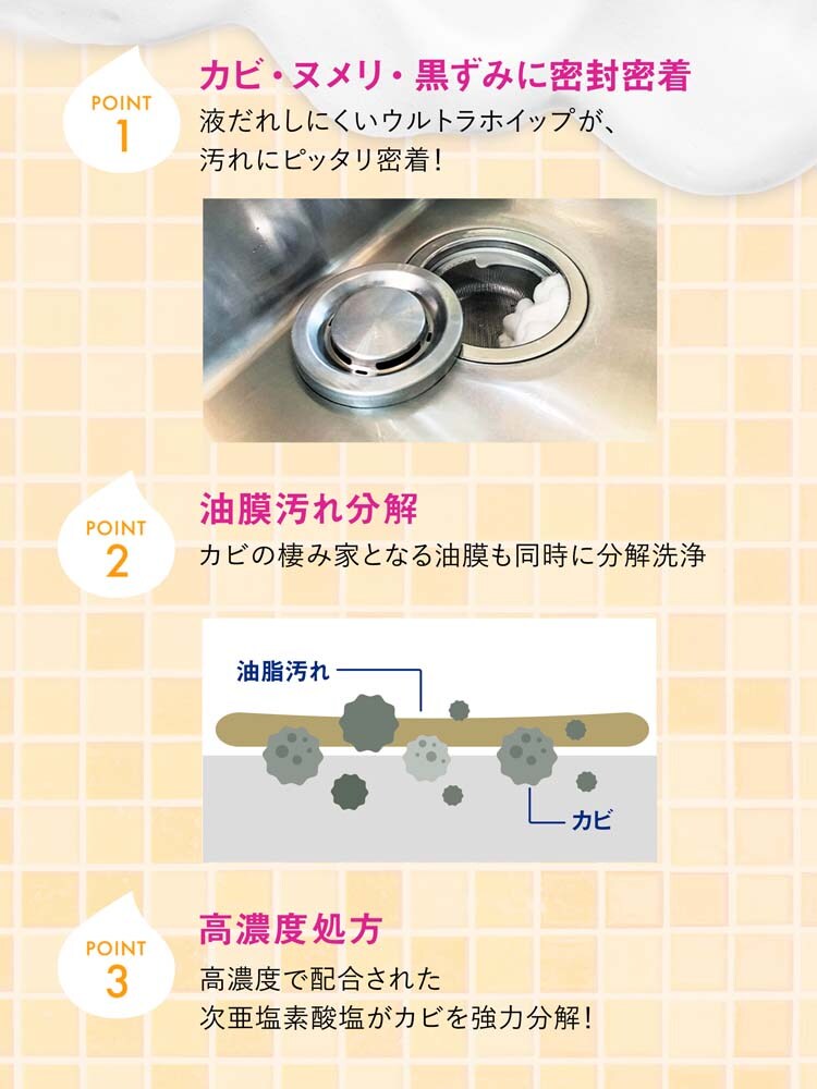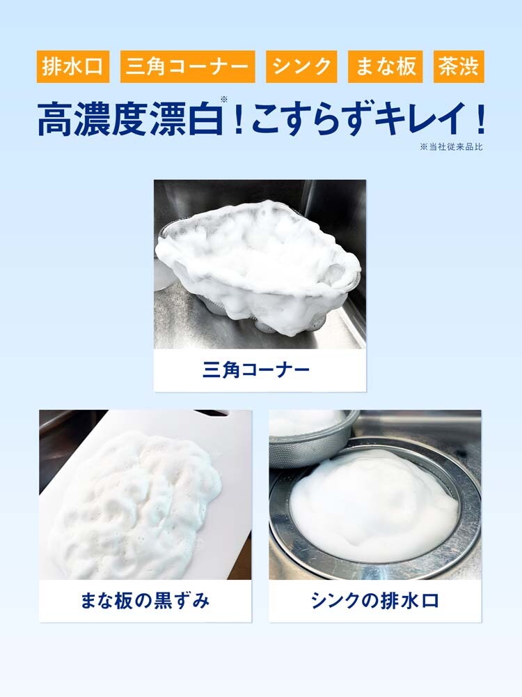 ●洗浄成分を高濃度で配合し、排水口や三角コーナー、シンク、まな板、茶渋などの汚れをこすらずに落とし、漂白除菌します。