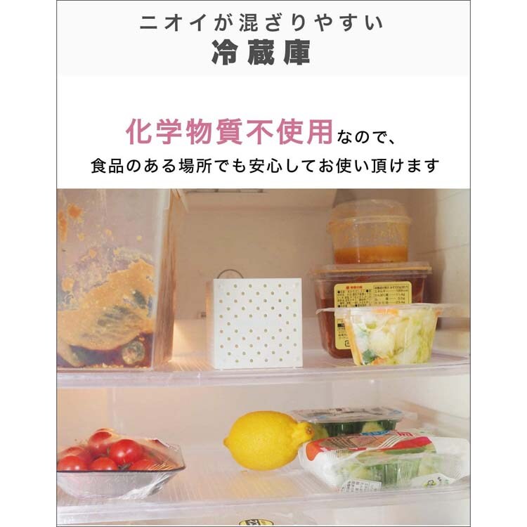 玄関、キッチン(冷蔵庫)、トイレ、押入れ、クローゼット、下駄箱、車内等ニオイの気になる場所に置くだけ。