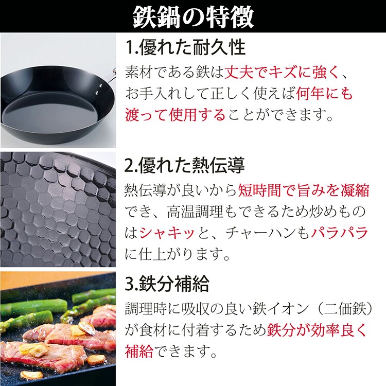 ●鉄は丈夫でキズに強く優れた耐久性が特長で、お手入れして適切に使えば何年にもわたって使用することができます。