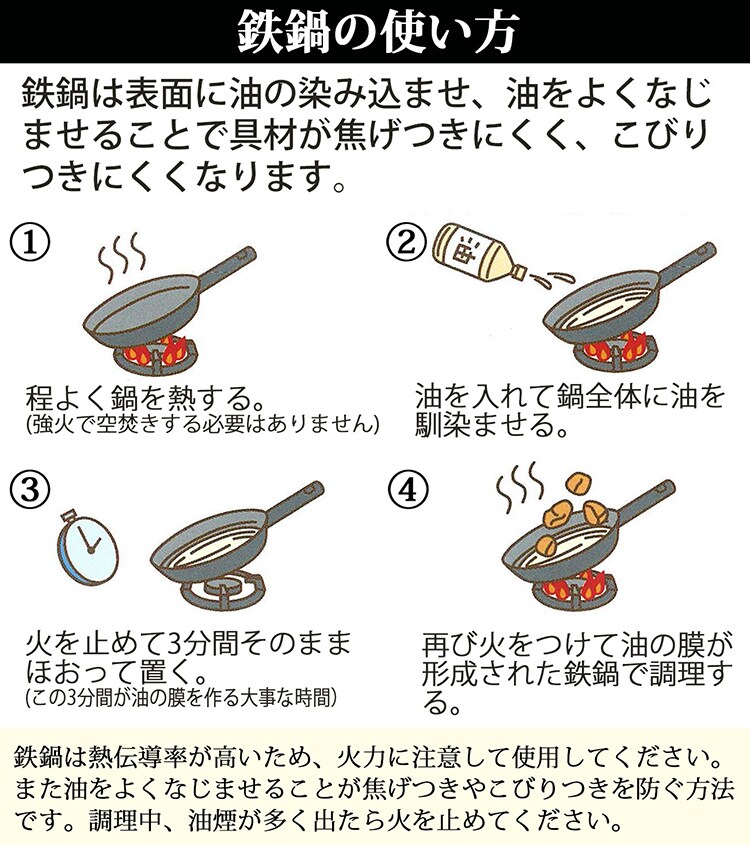 ●鉄鍋は表面に油をしみ込ませ、よくなじませることで具材を焦げにくく、こびりつきにくくします。
