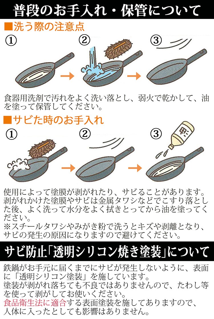 ●使用後は食器用洗剤で汚れをよく洗い落とし、弱火で乾かして油を塗って保管して下さい。