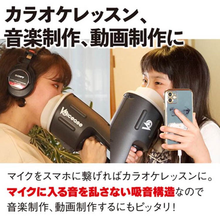 ●Voicease(ヴォイシーズ)は、マイクに装着するだけで自分の声や周囲の音を遮音できる「片手で持てる防音室」です。