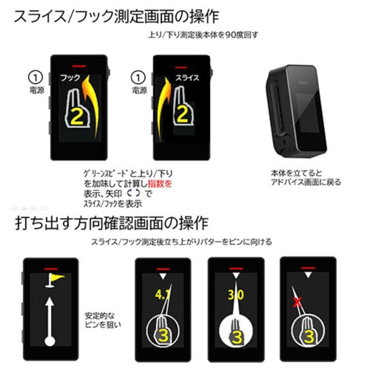 | ・カラー:ブラック ・素材:ABS樹脂、スチール ・サイズ(閉じた状態):H59×W27×D26.5mm ・サイズ(開いた状態):H59×W27×D39mm ・質量:約35g ・入力:D5V 1A~2A ・充電時間:約40分 ・内蔵電池:300mAh ・液晶:1.14サイズ/TFT液晶 ・使用環境温度:約0-40度 ・使用時間の目安:約2ラウンド(ホール毎に電源のON/OFFを行った場合) ・保証期間:1年間 ・生産国:中国 |