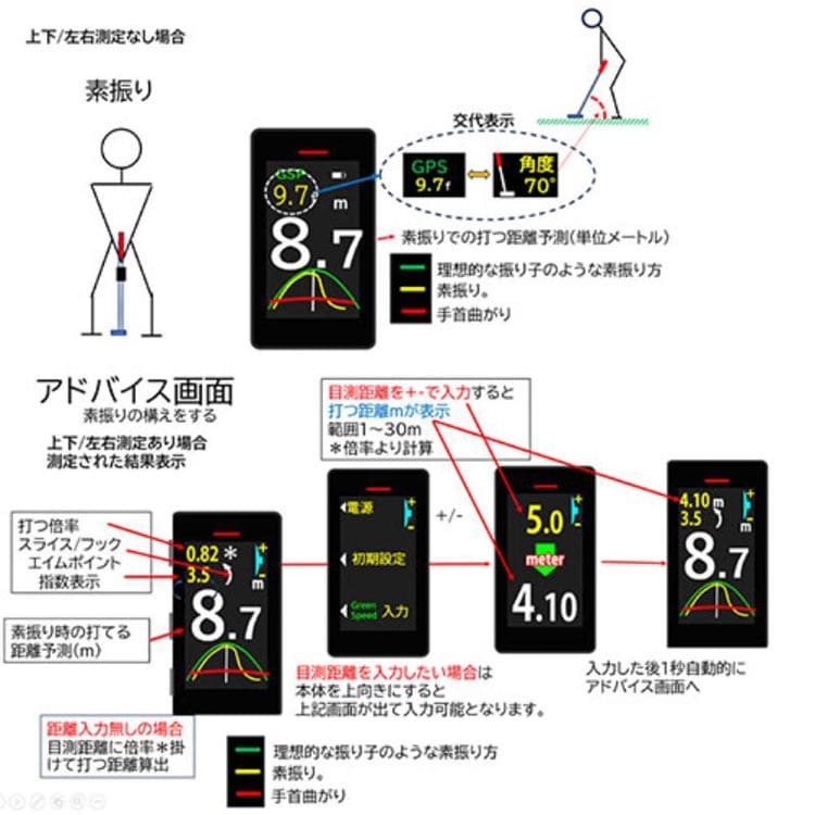 ●Green Caddieは、グリーンの距離や上り/下り、スライス/フックの傾斜、グリーンスピードを読み取り、パッド後に打った方向/適正な振り方/腕の回転距離をアドバイスします。