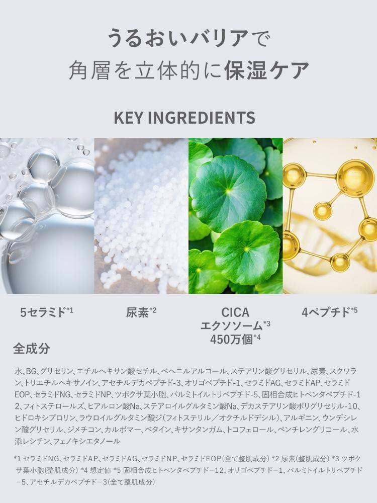 | 水、BG、グリセリン、エチルヘキサン酸セチル、ベヘニルアルコール、ステアリン酸グリセリル、尿素、スクワラン、トリエチルヘキサノイン、アセチルデカペプチド-3、オリゴペプチド-1、セラミドAG、セラミドAP、セラミドEOP、セラミドNG、セラミドNP、ツボクサ葉小胞、パルミトイルトリペプチド-5、固相合成ヒトペンタペプチド-12、フィトステロールズ、ヒアルロン酸Na、ステアロイルグルタミン酸Na、デカステアリン酸ポリグリセリル-10、ヒドロキシプロリン、ラウロイルグルタミン酸ジ(フィトステリル/オクチルドデシル)、アルギニン、ウンデシレン酸グリセリル、ジメチコン、カルボマー、ベタイン、キサンタンガム、トコフェロール、ペンチレングリコール、水添レシチン、フェノキシエタノール |