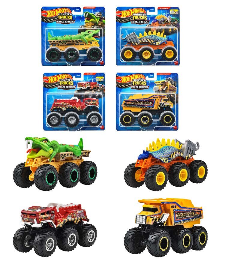 ●モンスタートラックを2通りで運べる6車輪のモンスタートラックJアソート!モンスタートラックを上に載せたり、引っ張ったりして運ぶことができます。