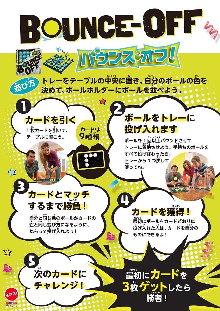 ●マテルゲーム:マテルゲームは、カードゲームの定番「ウノ」、子供向け戦略ゲーム「ブロックス」、シンプルなルールにはまる人が続出のゲーム「バウンス・オフ」をはじめ、大人から子供まで家族や友達みんなで楽しめる多種多様なゲームを提供しています。