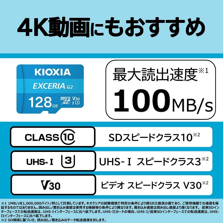| 容量:128GB 最大読出速度:100MB/s ※7 最大書込速度:50MB/s ※7 UHSスピードクラス:U3 ※8 ビデオスピードクラス:V30 ※8 SDスピードクラス:C10 ※8 インターフェース:UHS-I 外形寸法:15.0mm*11.0mm*1.0mm 質量:約0.3g 製品保証:5年間 同梱品:SD変換アダプタLADP1 ※7 1MB/sを1000000バイト/秒として計算しています。キオクシアの試験環境で特定の条件により得られた最良の値であり、ご使用機器での速度を保証するものではありません。読み出し/書き込み速度は使用する機器等の条件により異なります。書き込み速度は読み出し速度より遅くなります。 従来SDインターフェースでの転送速度は、UHS-Iインターフェースに比べ低下します。UHS-IIカードの場合、UHS-I/従来SDインターフェースでの転送速度は、UHS-IIインターフェースに比べ低下します。 ※8 SD規格に基づいた、読み出し/書き込みのデータ転送速度を示します。 |
