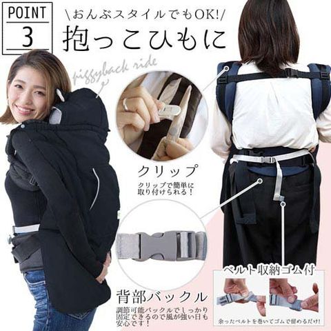 ●抱っこ紐につけてだっこ&おんぶ、ベビーカーにもつけられる3WAY仕様なのでお出かけのシーンに合わせて幅広く使用可