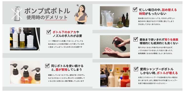 ●ボトル容器も詰め替えの手間(洗浄・乾燥・補充)も不要で、中身は空気に触れないため、いつもフレッシュで衛生的に使うことができます。