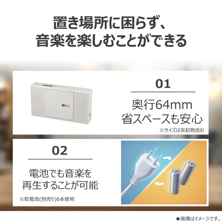 | ★CDプレーヤー部 ・チャンネル数:2チャンネルステレオ ・サンプリング周波数:44.1kHz ・メディア:CD、CD-R/RW(CD-DAフォーマットで記録された音楽ディスク) ★ラジオ部 ・受信周波数 FM:76.0~108.0MHz(0.1MHzステップ) AM:531~1、710kHz(9kHzステップ) ★共通部 ・電源:AC100V 50/60Hz、単3形乾電池×6本(別売) ・電池持続時間:TOSHIBA単3形アルカリ乾電池使用時 ・CD再生時:約3時間、ラジオ受信時:約14時間 ・スピーカー:Φ5cmコーン型×2 ・実用最大出力:1.5W+1.5W ・入力/出力端子:外部入力/ヘッドホン出力:Φ3.5mmステレオミニジャック ・消費電力:10W ・最大外形寸法:272(幅)×146(高さ)×62(奥行)mm (突起物含まず) ・質量:約1.2kg(乾電池含まず) ・付属品:電源コード、保証書付取扱説明書 |
