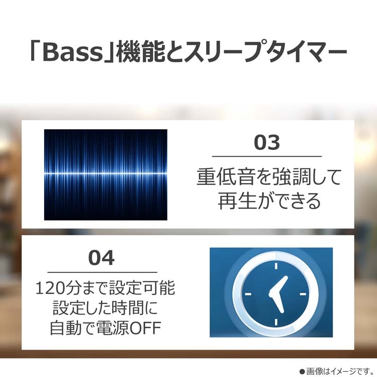 ●最大120分まで設定できる「スリープタイマー」付き。設定した時間になると、自動的に電源が切れるのでおやすみ時にも安心です。