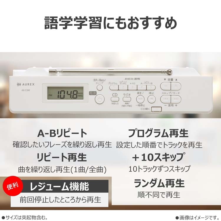 ●「リピート」「プログラム」「ランダム」再生機能はもちろんのこと、CDを止めて電源を切っても続きから再生できる「レジューム再生」機能や、聴きたい場所を繰り返し再生する「A-Bリピート」、CDの10トラックずつスキップできる「+10スキップ」など、コンパクトながら語学学習に便利な機能が充実しています。