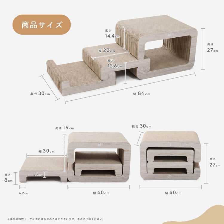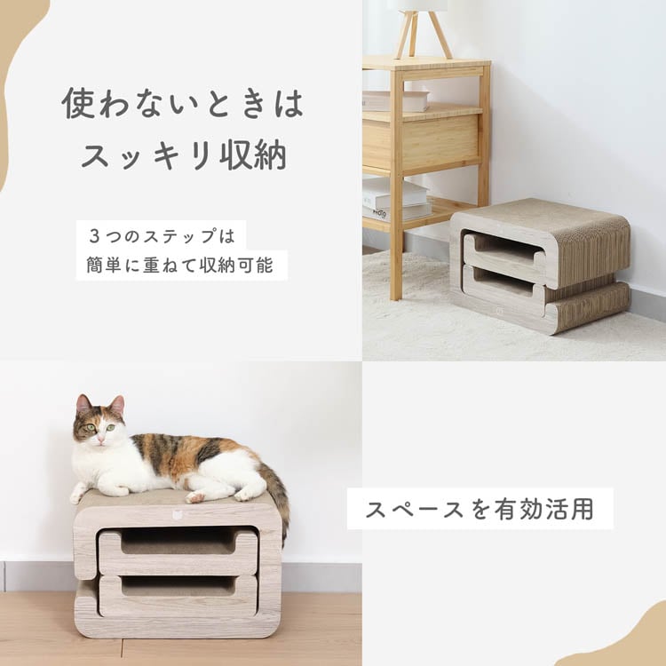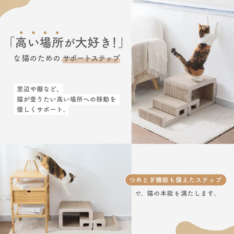 ●段ボール製の爪とぎ(猫壱のバリバリシリーズと同じ素材)のため、ステップ昇降時に爪が引っ掛かり、サポート力を高めています。
