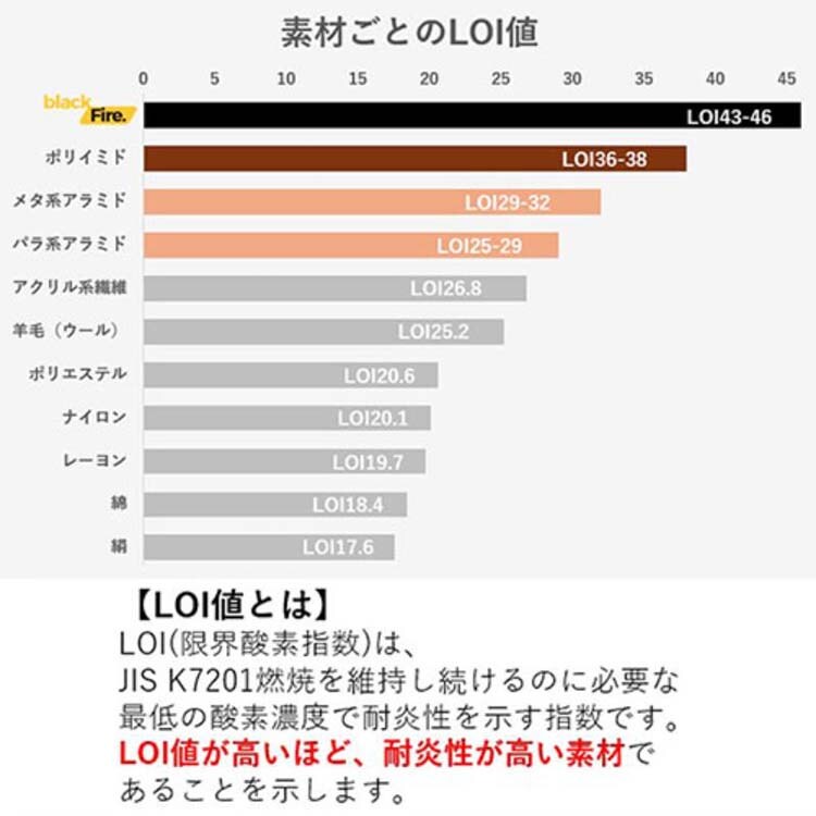 ●BLACK FIREは優れた柔軟性を備えながら、瞬間的には1800度の高温に耐え、1000度以上の環境でも3分以上の耐久性を誇る素材で不燃性紡績糸と生地です。