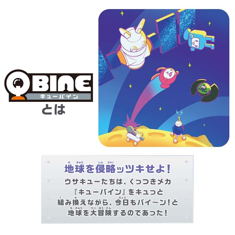 ●ウサギによく似た宇宙生命体「ウサキュー」(吸盤付き人形)と6輪のタイヤが特徴のメカ「キューバイン」のセットです。