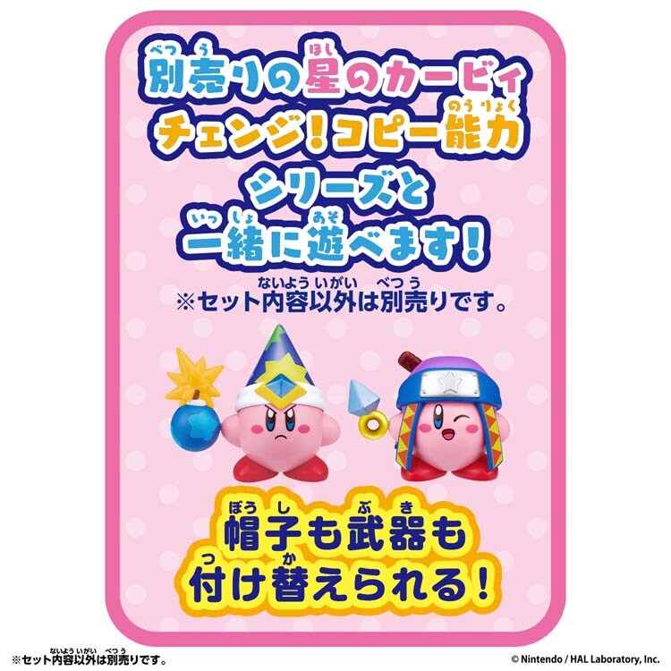 ●ゲーム中のカービィと同様に、ノーマル姿のカービィから、ニンジャとカッター、2つのコピー能力の姿に変身できるフィギュアのセットです。