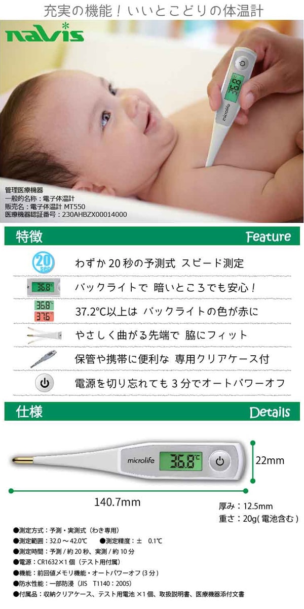 【Microlife 電子体温計 MT550 予測式20秒 バックライト付/7-4902-01の商品詳細】