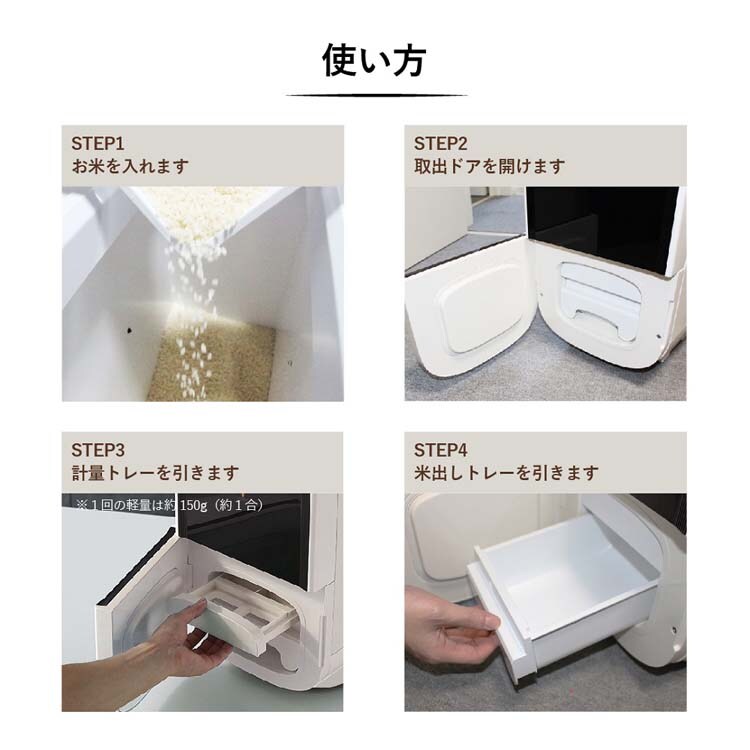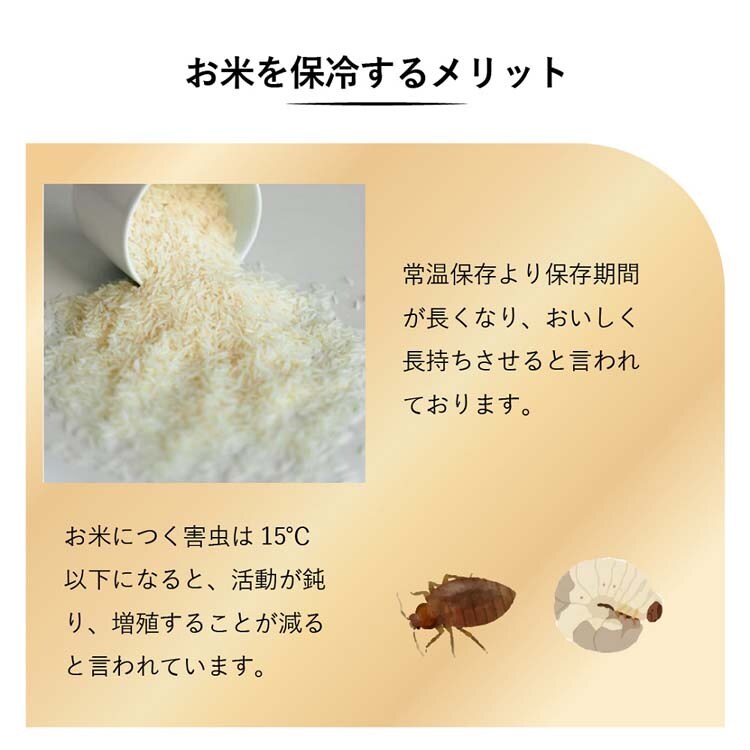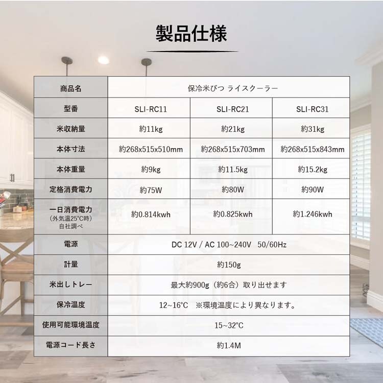 | ・本体外形寸法:約 (W)268×(D)515×(H)510mm ・本体質量:約9kg ・電源:DC 12V / AC 100-240V 50/60Hz ・定格消費電力:75W ・一日消費電力:約0.814kwh(外気温25度時) ・米収納量:約11kg ・コード長さ:約1.4m ・計量:約150g ・米だしトレー:最大約900g(約6合)まで取り出せます ・保冷温度:12度-16度 ※環境温度により異なります |