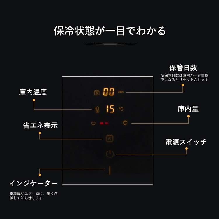 本体正面の表示で庫内温度や保管日数、庫内量が一目でわかります。