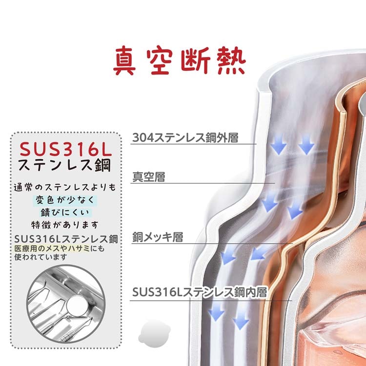 ●真空断熱構造で飲み物を長時間冷たいままキープ、暑い日でも快適に水分補給ができます。