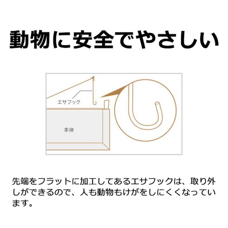●先端をフラットに加工してあるエサフックは、取り外しができるので、人も動物もケガをしにくくなっています。